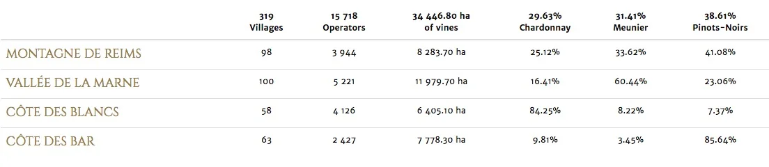The four main growing areas: the Montagne de Reims, the Vallée de la Marne, the Côte des Blancs and the Côte des Bar with their subregions.